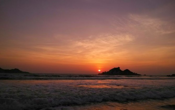 早晨五点半起来,打开帐篷就可以看日出了。虽然我时时刻刻紧盯着海平面,可还是不知道什么时候,太阳就探了出来。此时,所有的事物都是金色的,沙滩,海浪、渔船、小屿、还有我……
