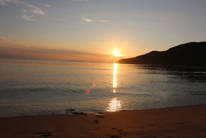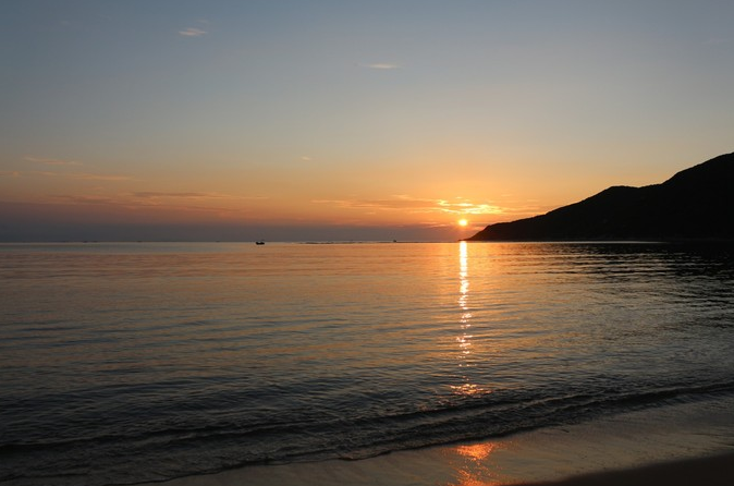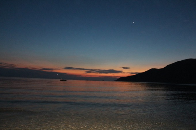 凌晨四点半,我被闹钟吵醒,一骨碌爬起来去洗漱,穿好衣服扛起三脚架就准备出发了。出了门,外面黑漆漆,天空中繁星点点。沿着小路走出来,一直向坡上走,几只小狗跑过来一路护送我们,在这伸手不见五指的黑夜里,我们四只默默地快步疾走,第一个岔道口是通往山上,由于不识路,我们走进去半路又折回来,继续往前又遇到一个岔道口,是一个小沙滩,走下去刚架好三脚架,米娜说这个地方不对,山峰挡住根本看不到日出,犹豫间我们又奔到马路上继续前行,最终在第三个岔道口见到一片宽广的沙滩。我们几个兴奋地奔过去,远远看见天边的朝霞,而启明星闪耀当空。那场景美极了!