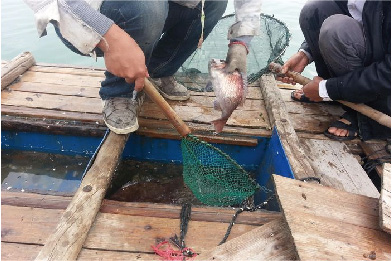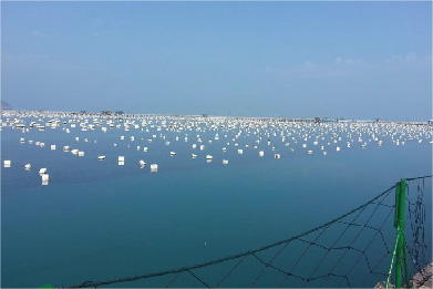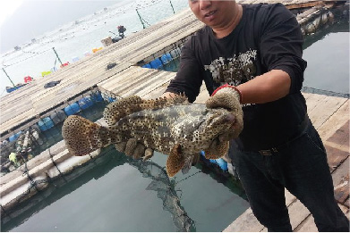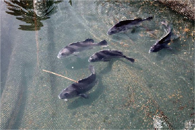 水池四周都围着渔网。渔网边上系者沙包,平时喂养的时候,沙包会沉下去,带着渔网到6米多深的海底。渔网的鱼大多是老板在海里大上来的野生的鱼。
