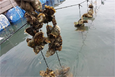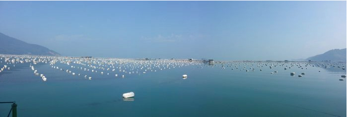 一串串沉甸甸的生蚝,紧密地凑在一起,被吊在厚实的泡沫底下,老板说他们家已经属于镇上最早养殖生蚝的人家,所以还一直靠这个来维持生活,多余的一些好的生蚝会被拿到渔排上,全部用粗绳串起来,因为对生蚝的了解与对品质的绝对信任,所以基本清蒸生蚝会被老板推荐到特色菜上。老板一直热情地讲解,还一手拿起几十公斤的绳子让我们不停地拍照。