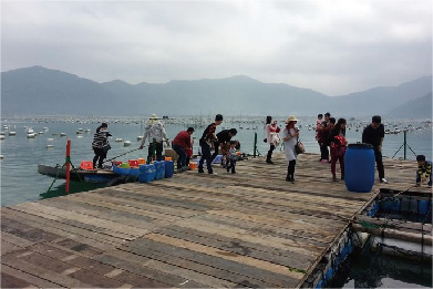 木排的面积非常大。木排中间有不少鱼池。每个鱼池里都喂着不同种类的海鲜。