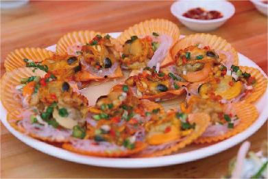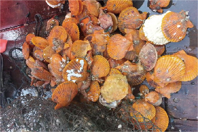 橙色的扇贝。从鱼池里拖起来的时候好多扇贝都开始不停的张合。发出卡卡的声音。
