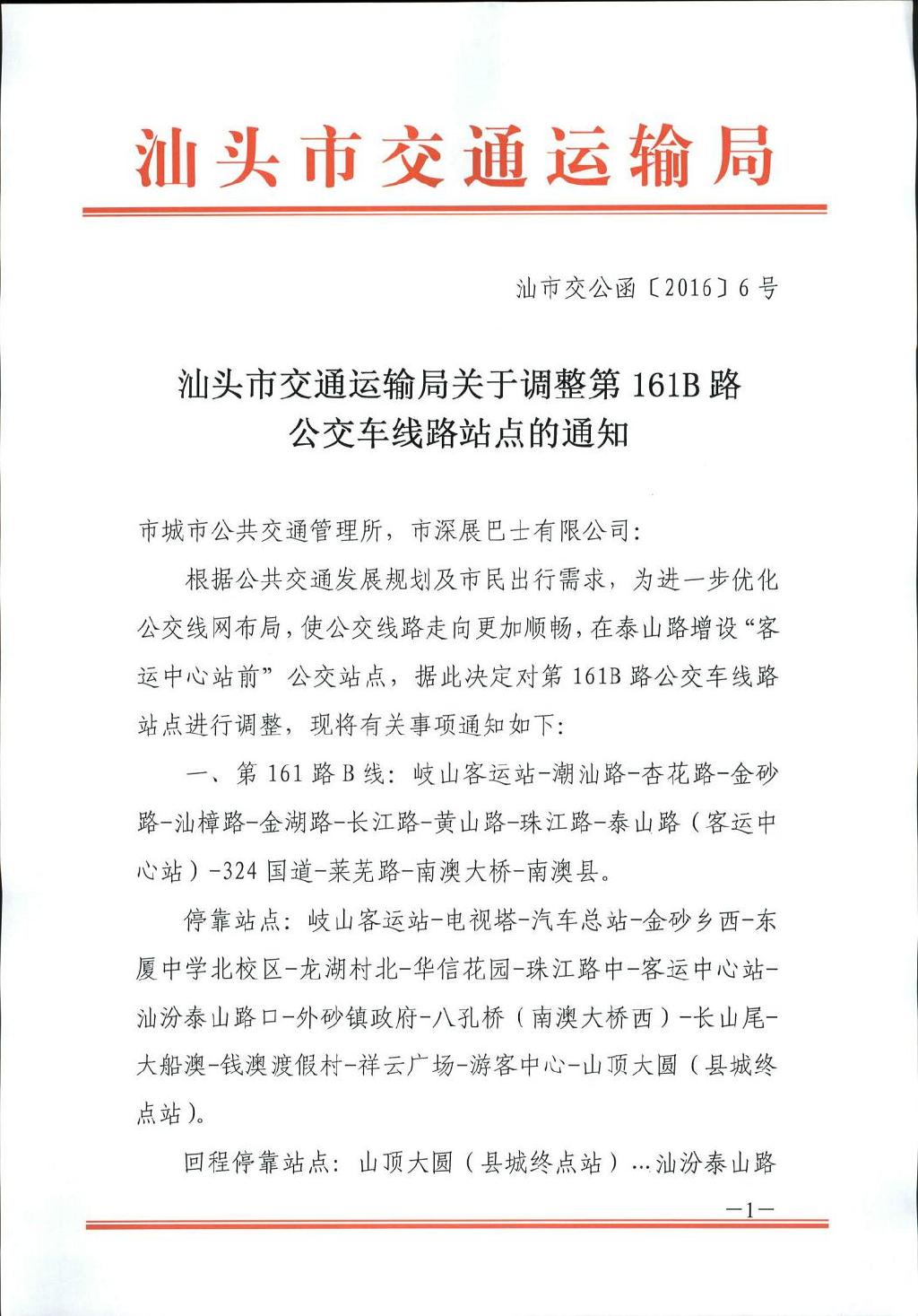 根据汕头交通运输局下发的内容,汕头—南澳161B线公交线路新增“客运中心站前”站,请各位相互告知。