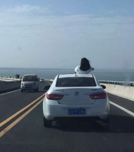 南澳大桥依旧频繁有游客冒险拍照,将头伸出车顶天窗,这是很危险的,请各位私家车司机要注意自己的行为,莫要惨剧发生才后悔。