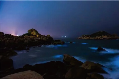 荧光海湾是指在某些海湾里聚集的鞭毛藻的非植物非动物等类似生物发出莹光而照亮海湾的现象。目前被称为生物荧光海湾的地方全世界只有7个,三个在波多黎各,两个在澳大利亚,一个在马尔代夫,还有一个在辽宁大连。