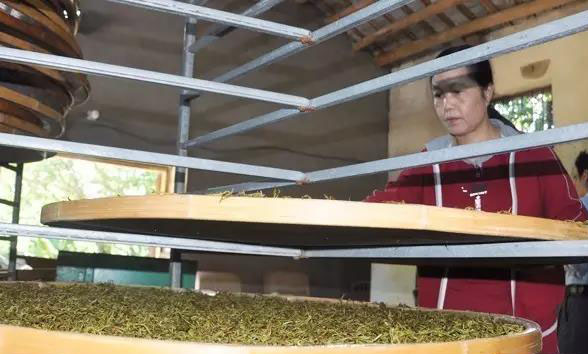 而在制茶厂里,机器轰隆作响,人们正忙碌着处理一筐筐刚刚采下来的茶叶,让它们“进入流程”。记者到达的时候是上午10时多,制茶的王姐正要把一批已经发酵好的茶叶送入炒茶炉,而这批茶叶是她前一天晚上熬夜进行过4道工序的。“制茶是一个繁琐的过程,每一个工序都不得马虎,稍有不慎就会‘香消玉殒’,之前辛苦的劳作也都会前功尽弃。”王姐一家有20多亩茶园,种植了“锯朵仔”、“白叶”、“鸭屎香”等10几个品种的茶叶,正常年份里,每年能生产五六百斤茶叶。“但今年‘行情’不给力。”王姐的丈夫余先生告诉记者,去年冬天旱,温度高,今年春天又冷,造成今年茶叶长得晚又减产。尽管春茶收得晚就卖不了高价,但茶农们还是秉持着顺天意、应自然的种植法则,“不能做‘拔苗助长’的事情,否则茶叶的品质就会受影响。”