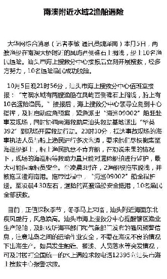 本月5日,两艘渔船在南澳大桥附近的凤屿西侧礁石上搁浅,船上10名渔民遇险。经市海上搜救分中心努力搜救,10名遇险渔民成功脱险。深秋季节汕头附近海面风急浪高。市海上搜救分中心提醒辖区渔业生产船舶,及时收听海事、天气象部门发布的预警信息,不要在海况不良的情况下出海生产